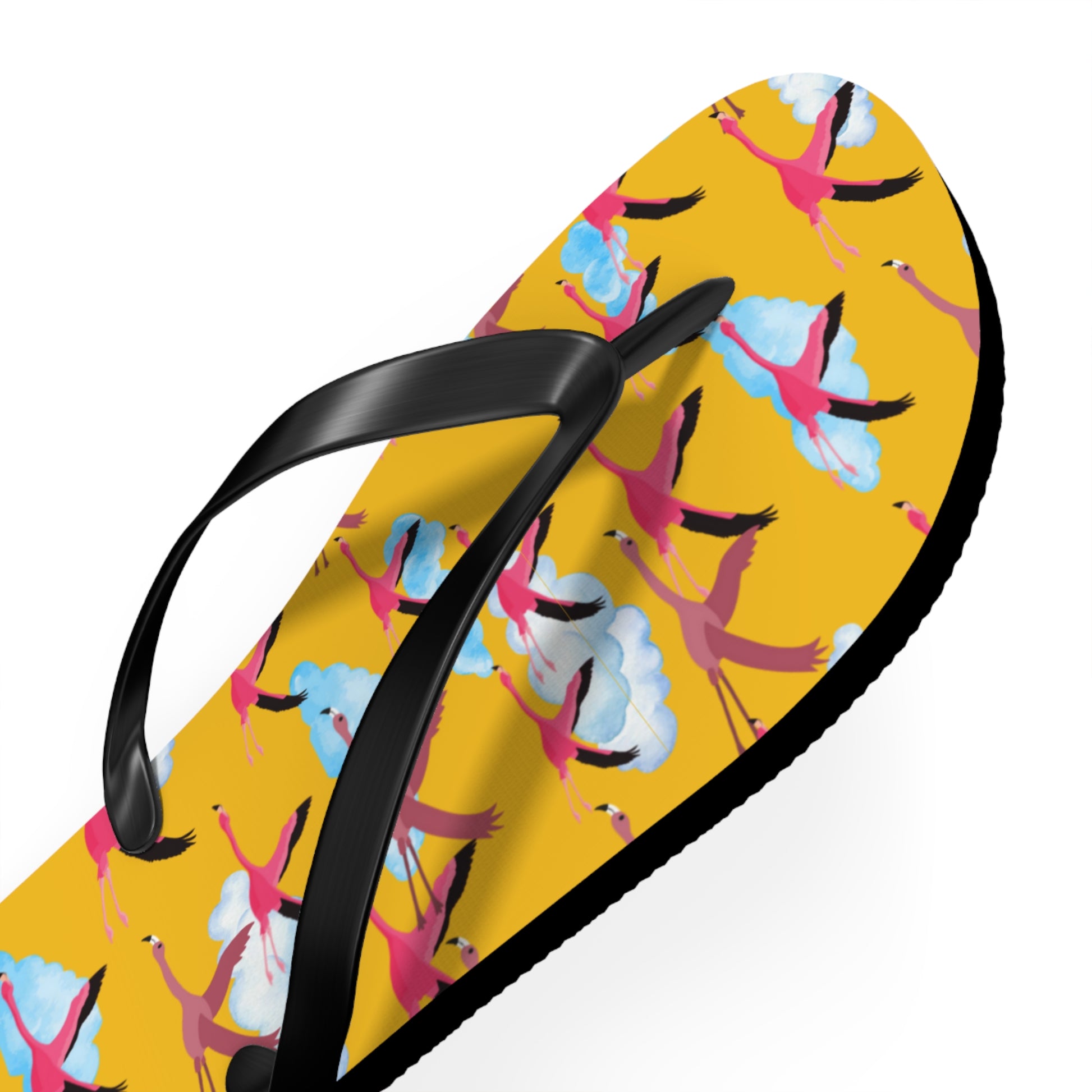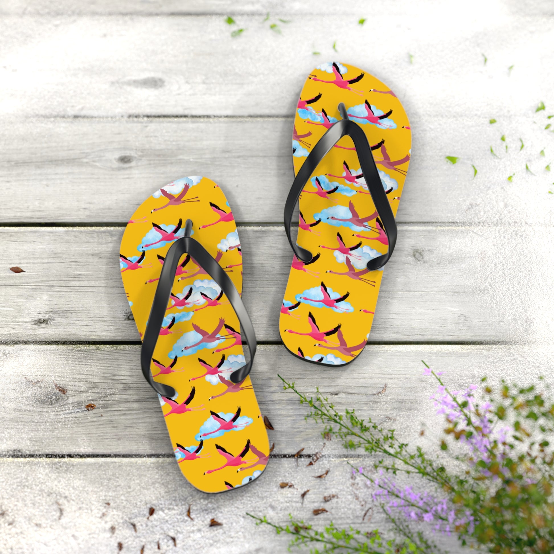 Flying Flamingo Print Flip Flops (Yellow), Summer Sandals, Beach Footwear, Vacation Essentials, Gift for Nature Lovers, Cute Outdoor Wear