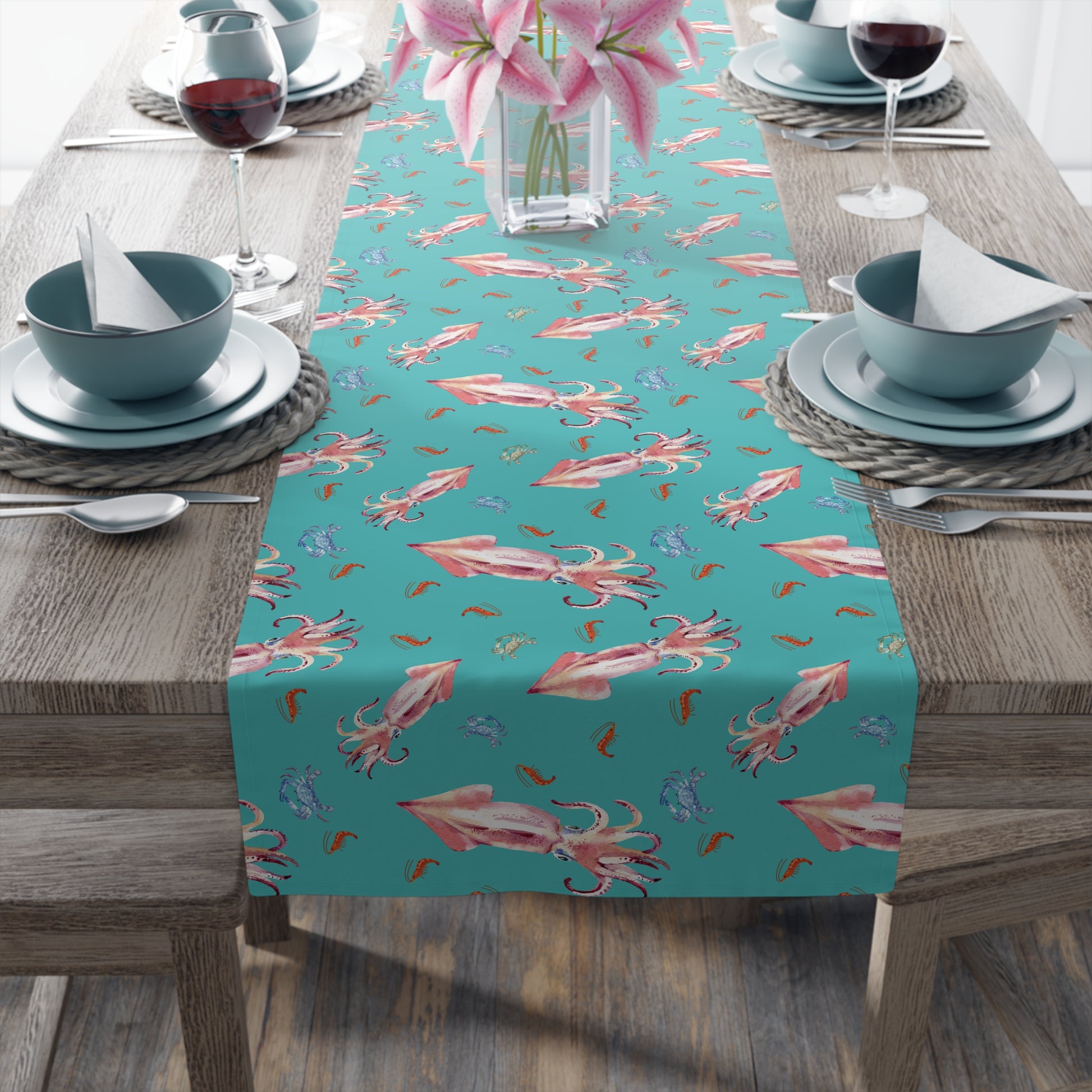 This Bahari Table Runner in polyester adds a refreshing coastal charm to any dining table. Inspired by ocean life and seaside hues, its vibrant design brings a fun, breezy vibe to your home décor. Perfect for those who love bold, unique patterns, this table runner is ideal for summer parties, outdoor barbecues, beach-inspired tablescapes, and tropical-themed gatherings.